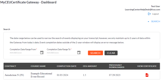 If you have any questions regarding the MyCEUCertificate Gateway, email us at LearningCenterHelpDesk@fcso.com.
